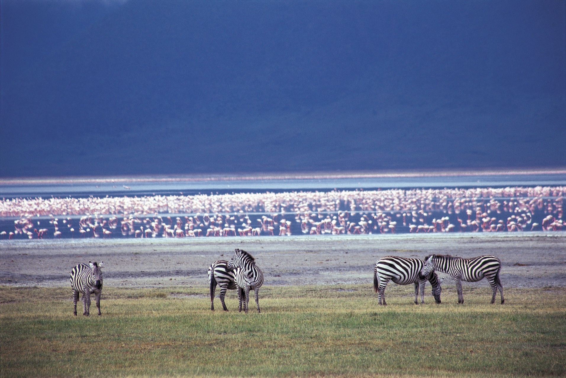 The Ngorongoro Crater, a UNESCO World Heritage Site, is the largest unbroken volcanic caldera in the world. The crater, which formed when a large volcano exploded and collapsed on itself, is 610m deep (2,000 ft) and its floor covers 260 sq km (100 sq mi). The crater is home to up to 30,000 animals including wildebeest, zebra, buffalo, elephant, hippo, hyena, jackal, lion, ostrich, black rhino, warthog, gazelle, giraffe, flamingo, and ostrich.
